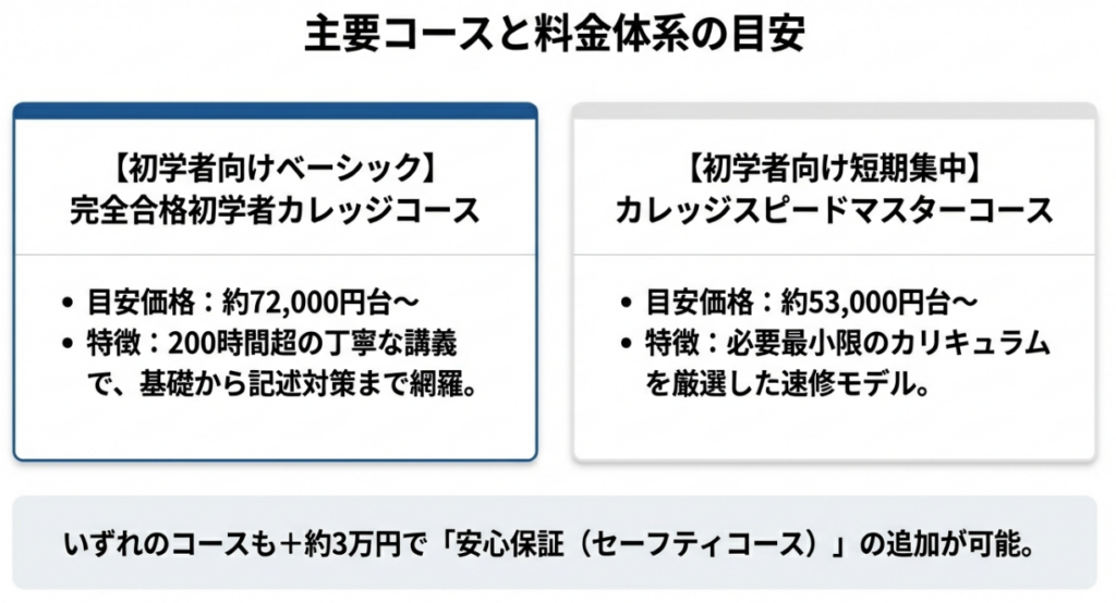 例えば、初学者向けの「完全合格カレッジコース」が、割引適用で6万円台から受講できるケースもあり、講義時間200時間を超える充実度を考えれば、他校を圧倒するコスパと言えます。
