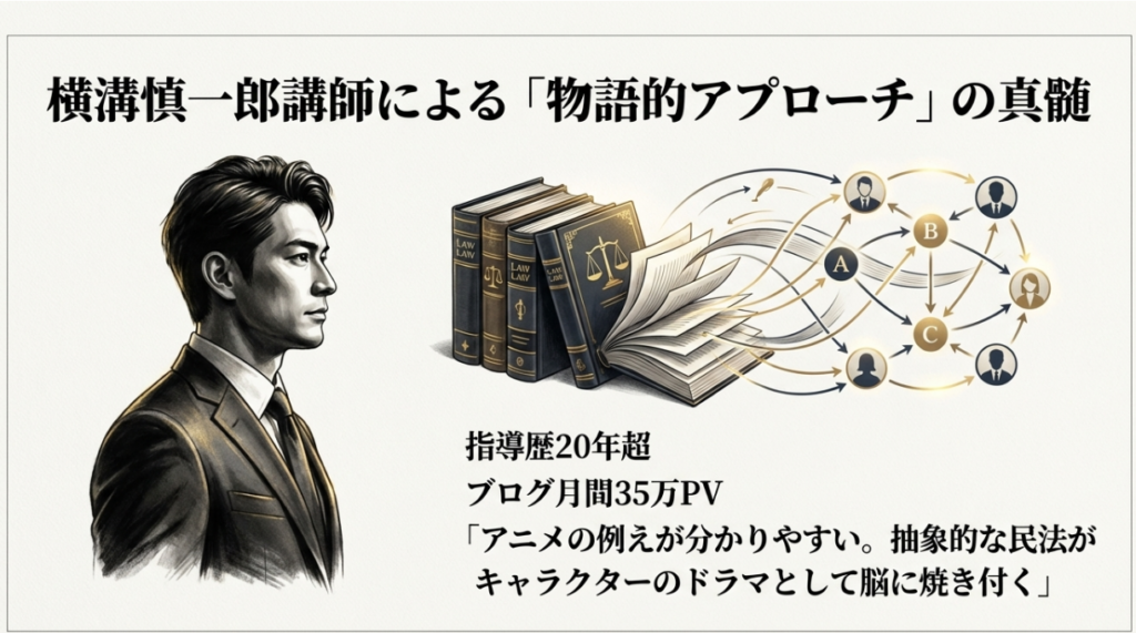 LEC行政書士講座の評判を語る上で、看板講師である横溝慎一郎先生の存在を外すことはできません。行政書士試験の指導歴は20年を超え、LECが40年以上にわたって積み上げてきた合格ノウハウを最も体現している講師と言っても過言ではありません。2025年度も321名のコース生合格者を輩出していますが、合格体験記の多くに「横溝先生の言葉に救われた」「先生の講義のおかげで法律が楽しくなった」という口コミが寄せられています。特に法律初学者が挫折しやすい民法や行政法の難解な概念を、独自の切り口で噛み砕く講義は圧巻です。本セクションでは、なぜ横溝先生の講義がこれほどまでに支持され、多くの合格者を生み出し続けているのか、その具体的な魅力を3つのポイントで解説します。