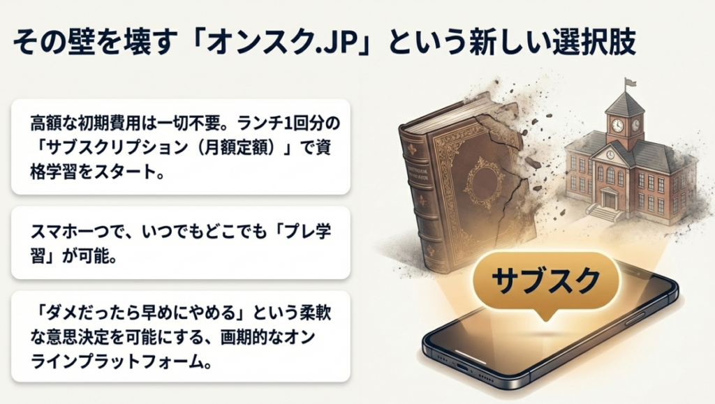 一方で、私自身の経験や多くの口コミ・評判から言えるのは、最初から10万円以上の高額な通信講座に申し込むリスクを避けたい人にとって、オンスクは最強の「リトマス試験紙」になるということです 。月額1,078円(税込)からという低価格で、大手予備校TACのノウハウが詰まった講義に触れられるため、自分に行政書士の勉強が合っているかをノーリスクで確認できます 。