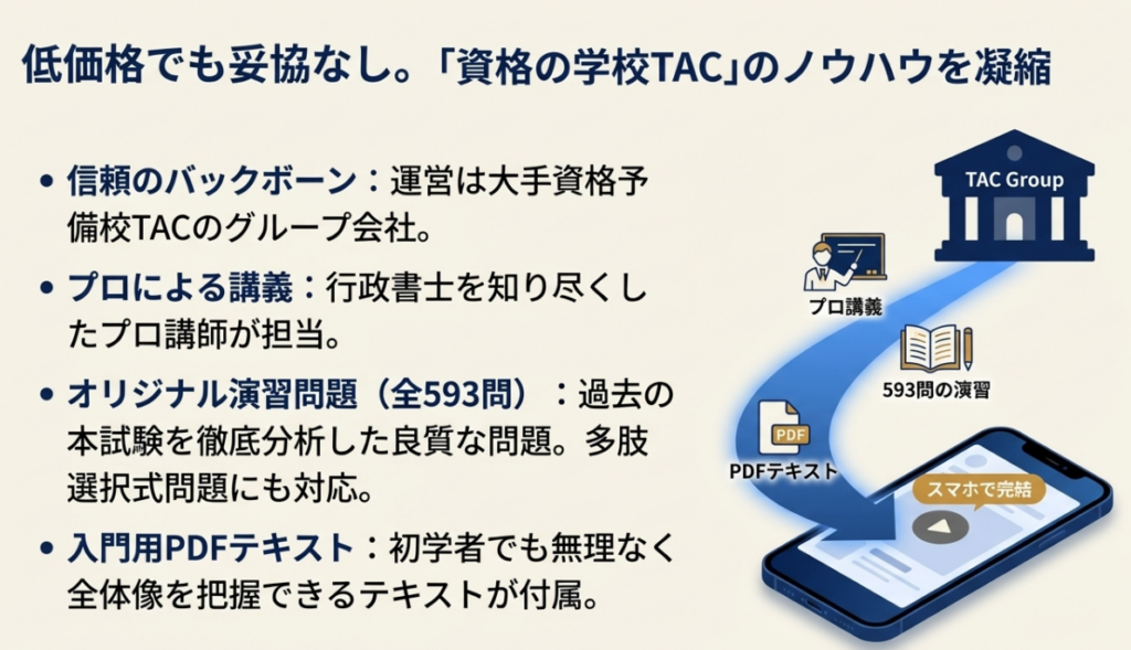 オンスクの行政書士講座は、低価格ながら講義のクオリティが非常に高いという大きなメリットがあります 。その最大の理由は、運営会社が大手資格予備校であるTACの関連会社であり、講義内容に長年の指導ノウハウが惜しみなく投入されているためです 。