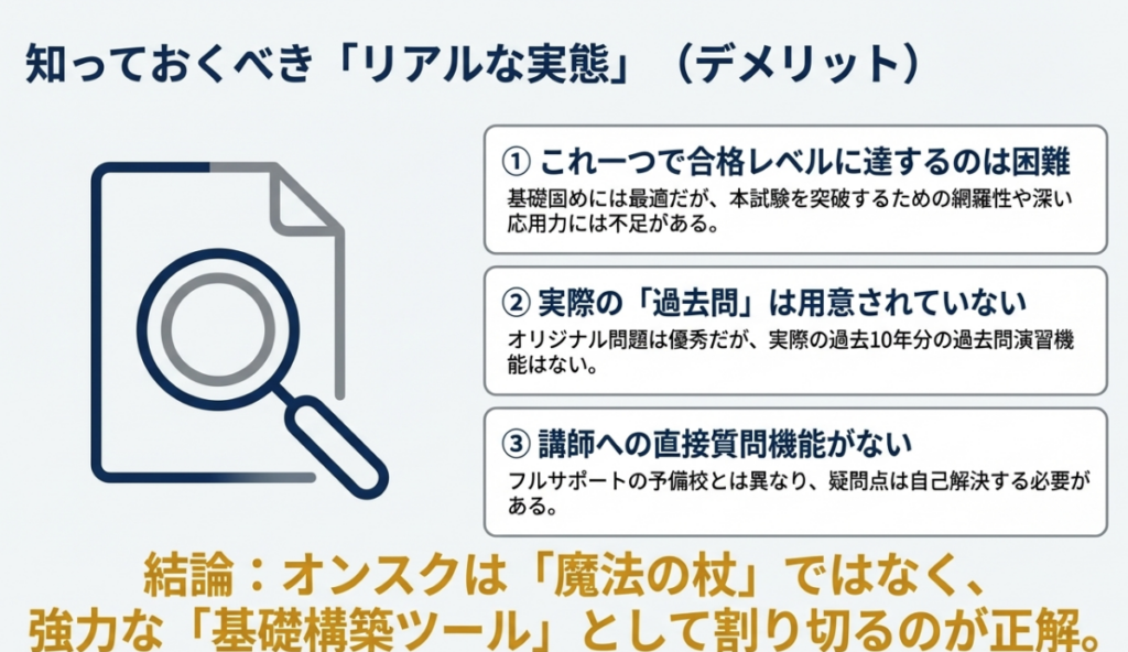 結論として、オンスクは「これだけで受かる魔法の杖」ではなく、独学を加速させるための「高機能な地図」として活用するのが正解です 。