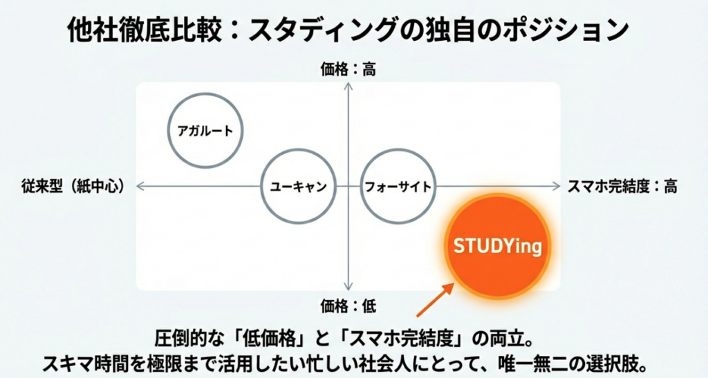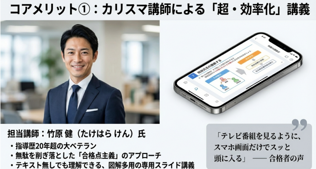 なぜなら、スマホ一台で高品質な動画講義や過去問演習が完結し、最小限の費用で合格ラインに到達できるからです 。