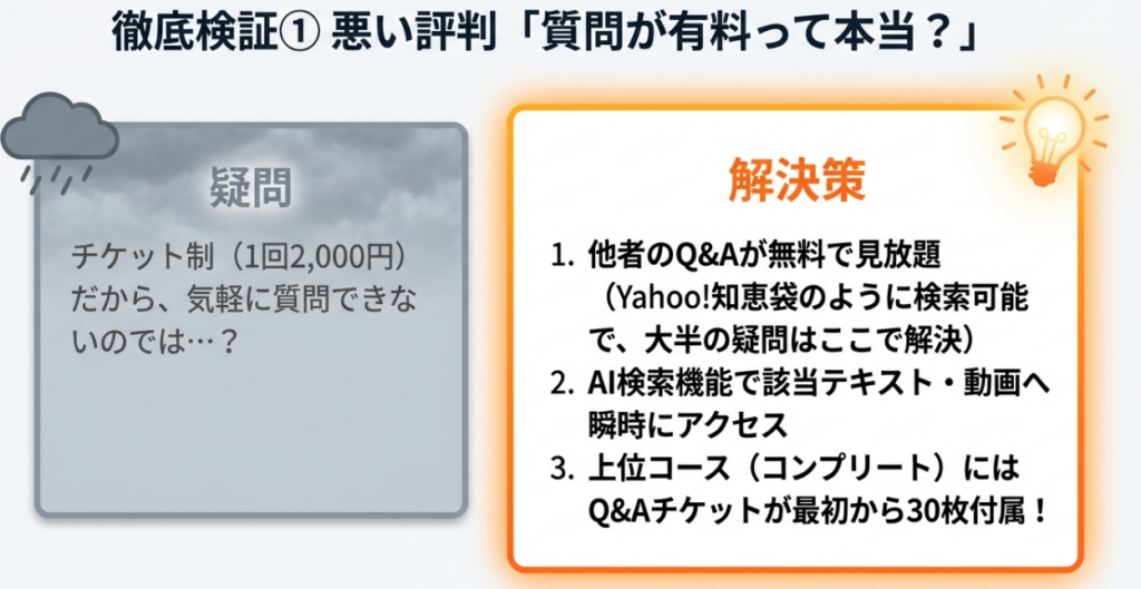 はい、可能です。有料のQ&Aチケットを購入するか、あらかじめチケットが30枚付属している「コンプリートコース」を選択することで質問ができます 。また、他受講生の過去の質問回答は無料で検索・閲覧可能です 。