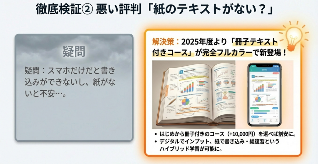 • 追加費用のフォロー:紙のテキストは別売りですが、スマホでのデジタル学習に特化することでこの価格を実現しています 。