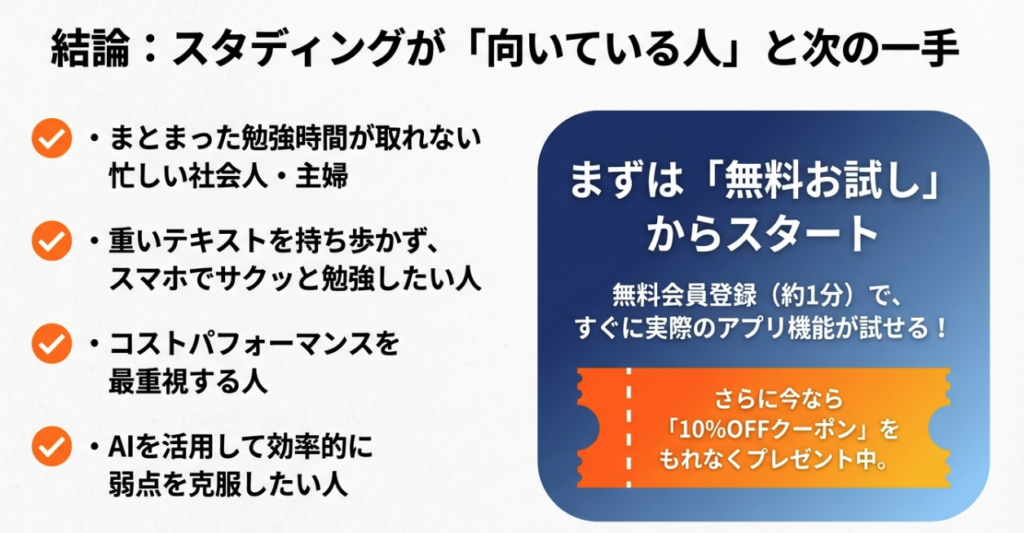 あなたが「効率」と「コスパ」を最優先して最短合格を狙うなら、スタディングは現状、最高の選択肢と言えるでしょう。合格時には1万円の「合格お祝い金」も用意されており、実質的な負担をさらに減らすことも可能です 。