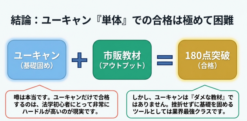 基礎知識は身につきますが、近年の試験難化や配点の高い記述式対策を考慮するとテキストだけでは情報が不足します。確実に合格を狙うなら市販の過去問や判例集の買い足しが必要になるケースが多いのが実情です。