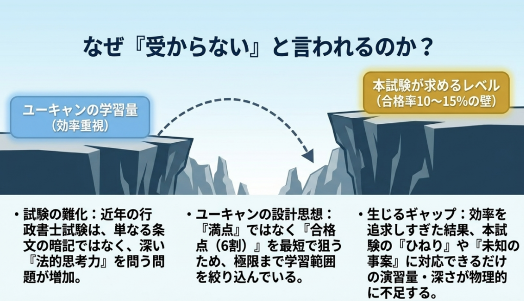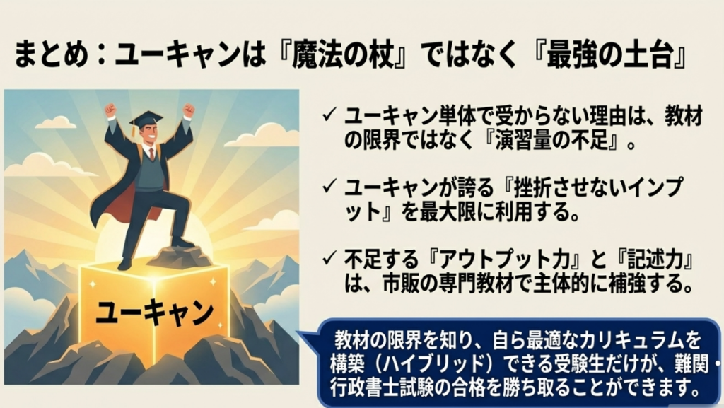 難易度が上がっている今の行政書士試験において、情報量が少ないユーキャンだけで一発合格を狙うのは、かなり勇気のいる決断です。約800時間の勉強時間を絶対に無駄にしたくない人は、教材選びで妥協してはいけません。