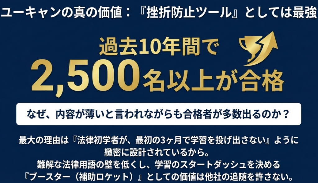 むしろ、「法律の勉強に初めて挑戦する初学者が、途中で挫折せずに最後までやり切る」という点においては、他社にはない圧倒的なメリットがあります。