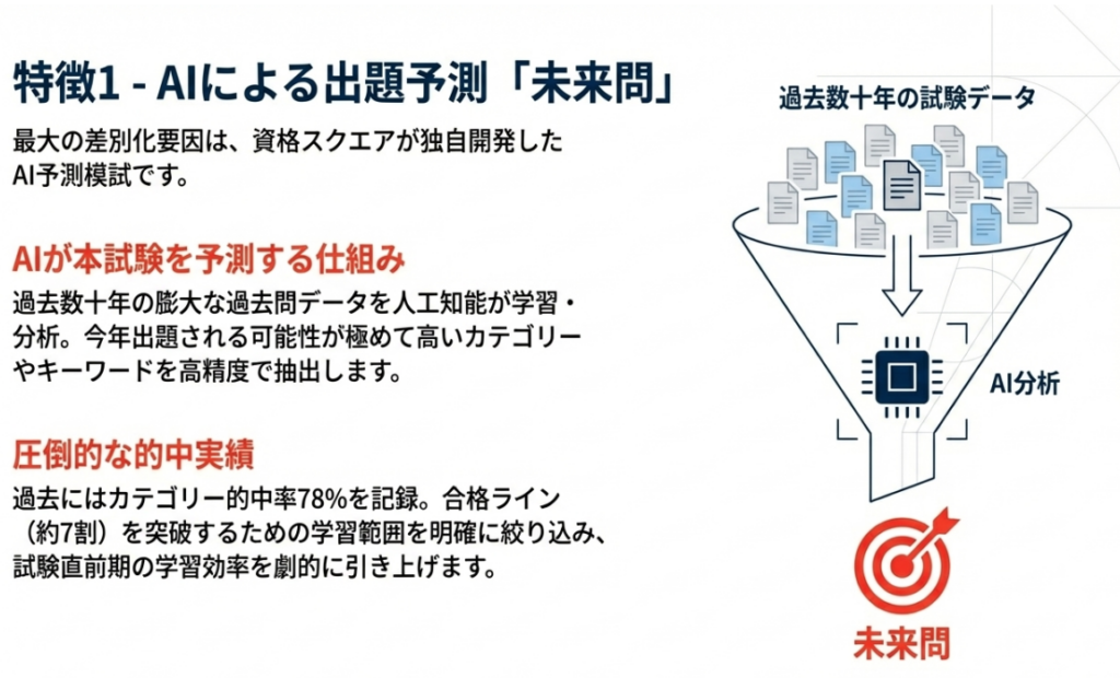 AIが過去の出題データを分析して作成する「未来問」は、過去に70%以上のカテゴリー的中率を出した実績があります。出題可能性の高いポイントに絞って学習できるため、試験直前の総仕上げとして非常に有効です。