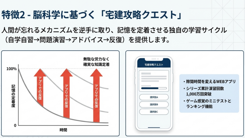 | 宅建攻略クエストの特徴 | スキマ時間の活用例 | 得られる具体的なベネフィット |