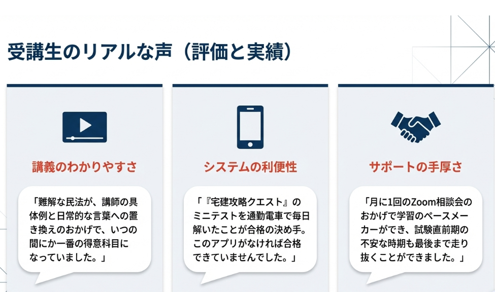 「宅建試験の合否を分ける一番の難関である『権利関係』の攻略に特に力を入れたカリキュラムになっており、初学者でも挫折せずに進められました。」