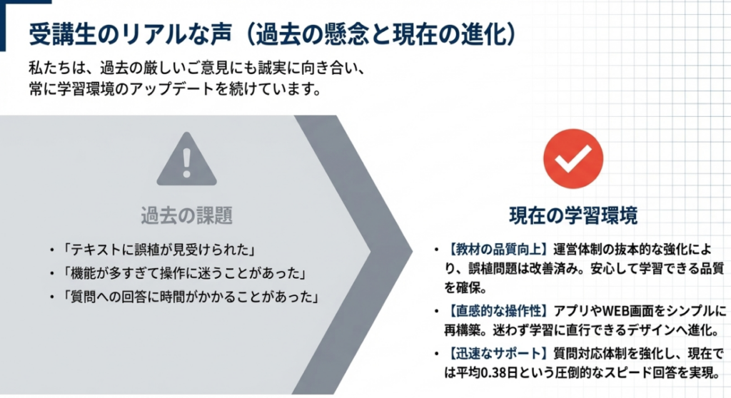 サービス終了の噂などは根拠のない情報も多く、現在も最新のカリキュラムがしっかり提供されているので全く心配いりません。短期集中型で駆け足に感じるという意見もありますが、忙しい社会人が最短で合格をつかみ取るためには、出題されやすいポイントに絞った効率的な学習が不可欠です。満点ではなく「合格点」を確実に取りに行くための戦略的なカリキュラムと言えます。
