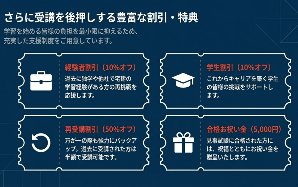 資格スクエアでは、学生の方を対象とした10%オフの学割や、他社で学習経験がある方向けの経験者割引、再受講割引などのクーポンが用意されています。これらを活用することでお得に受講を開始できます。